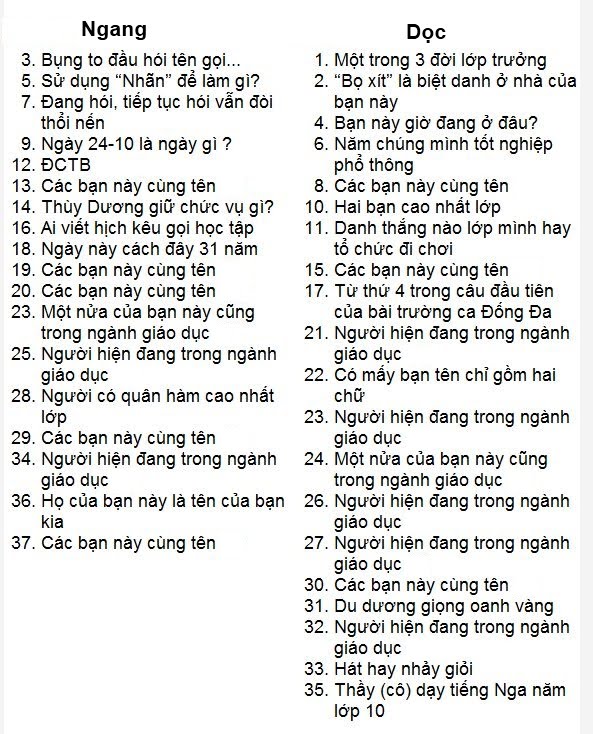 Chào mừng Ngày Nhà Giáo việt Nam và cũng để giải trí cuối tuần tớ tặng các bạn một ô chữ. Bạn nào có máy in thì in ra cho dễ chơi nhé. Lưu ý là nhấn chuột vào ô chữ cho nó to ra rồi hẵng in. Bạn nào không có máy in thì chịu khó chép ra vậy.